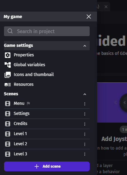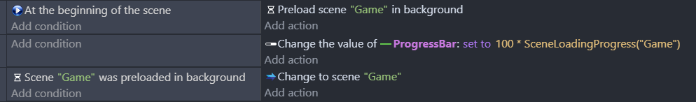 SceneLoadingProgress("TargetScene")— an expression returning a number from 0 (nothing loaded) to 1 (fully loaded). Connect it to a resource bar to give visual feedback.- Scene preloaded condition — becomes true when all resources for the target scene are ready. Use it to switch to the target scene automatically.