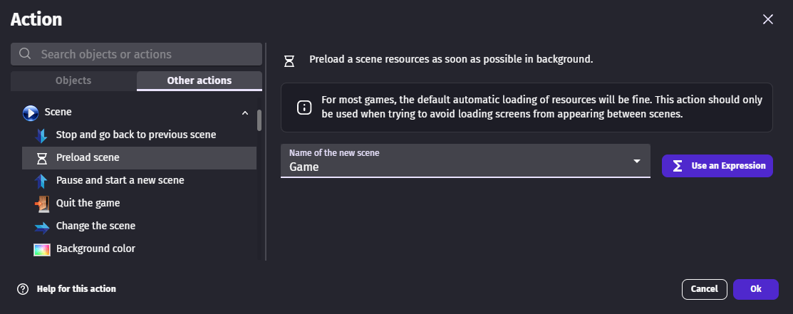 The Preload scene action lets you override the default loading order by requesting that a specific scene's resources are loaded in the background as soon as possible. Use it at the beginning of a scene (for example, at the start of a menu scene) to ensure the next level is ready by the time the player reaches it.